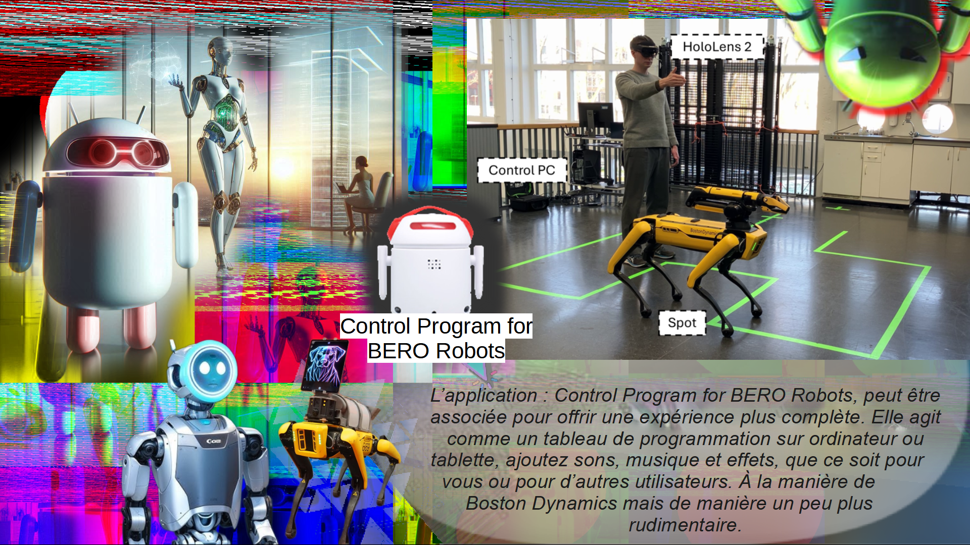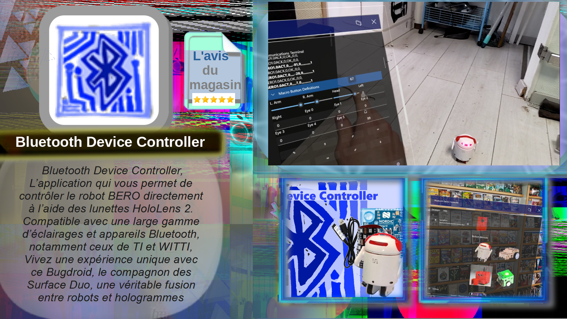 Bluetooth Device Controller, L’application qui vous permet de contrôler le robot BERO directement à l’aide des lunettes HoloLens 2. Compatible avec une large gamme d’éclairages et appareils Bluetooth, notamment ceux de TI et WITTI, Vivez une expérience unique avec ce Bugdroid, le compagnon des Surface Duo, une véritable fusion entre robots et hologrammes. L’application : Control Program for BERO Robots, peut être associée pour offrir une expérience plus complète. Elle agit comme un tableau de programmation sur ordinateur ou tablette, ajoutez sons, musique et effets, que ce soit pour vous ou pour d’autres utilisateurs. À la manière de Boston Dynamics mais de manière un peu plus rudimentaire.