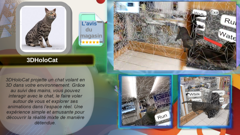3DHoloCat projette un chat volant en 3D dans votre environnement. Grâce au suivi des mains, vous pouvez interagir avec le chat, le faire voler autour de vous et explorer ses animations dans l’espace réel. Une expérience simple et amusante pour découvrir la réalité mixte de manière détendue.