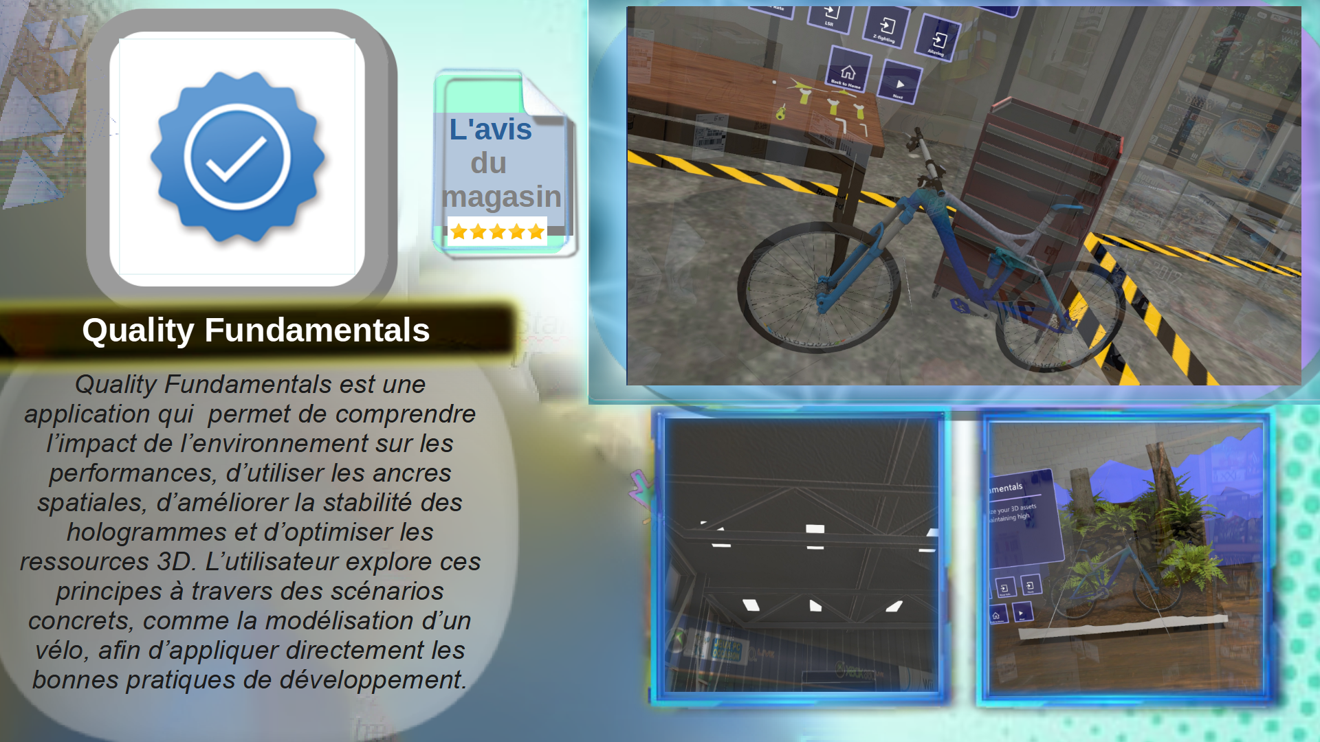 Quality Fundamentals est une application qui permet de comprendre l’impact de l’environnement sur les performances, d’utiliser les ancres spatiales, d’améliorer la stabilité des hologrammes et d’optimiser les ressources 3D. L’utilisateur explore ces principes à travers des scénarios concrets, comme la modélisation d’un vélo, afin d’appliquer directement les bonnes pratiques de développement.