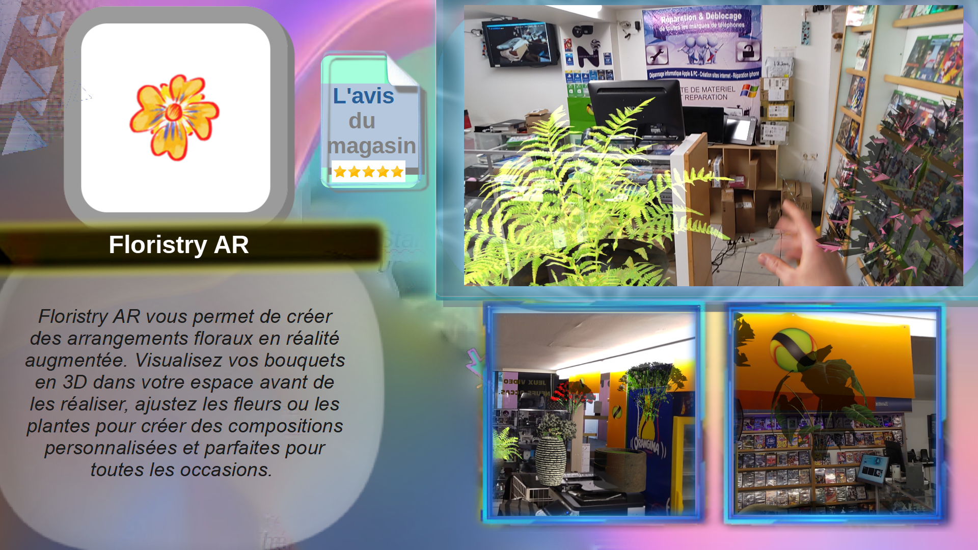 Floristry AR vous permet de créer des arrangements floraux en réalité augmentée. Visualisez vos bouquets en 3D dans votre espace avant de les réaliser, ajustez les fleurs ou les plantes pour créer des compositions personnalisées et parfaites pour toutes les occasions.