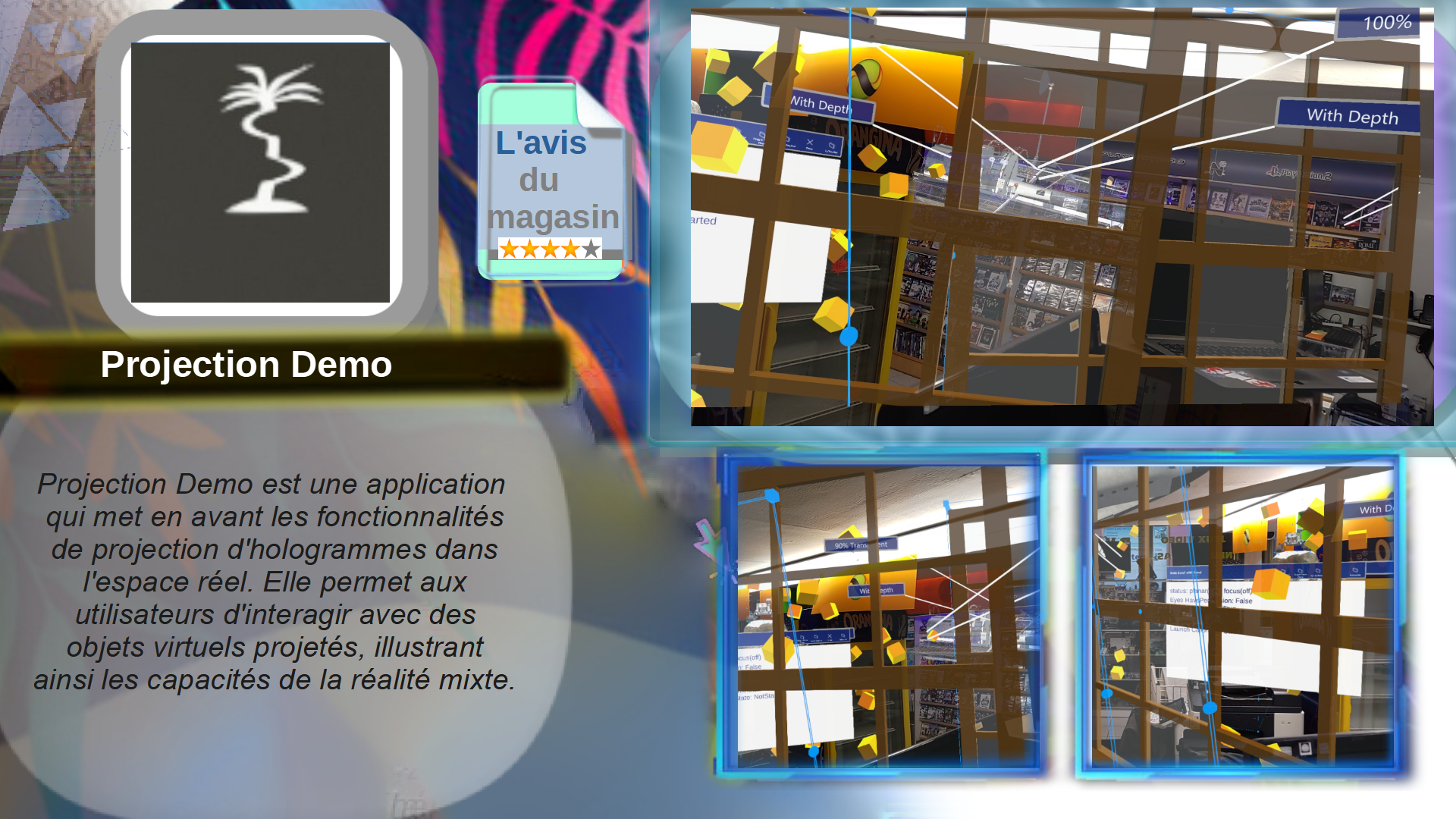 Projection Demo est une application qui met en avant les fonctionnalités de projection d'hologrammes dans l'espace réel. Elle permet aux utilisateurs d'interagir avec des objets virtuels projetés, illustrant ainsi les capacités de la réalité mixte.