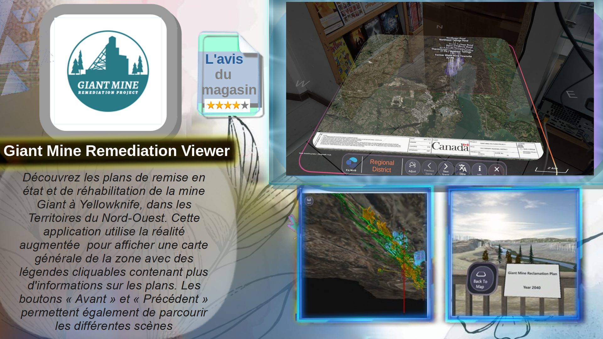 Découvrez les plans de remise en état et de réhabilitation de la mine Giant à Yellowknife, dans les Territoires du Nord-Ouest. Cette application utilise la réalité augmentée pour afficher une carte générale de la zone avec des légendes cliquables contenant plus d'informations sur les plans. Les boutons « Avant » et « Précédent » permettent également de parcourir les différentes scènes
