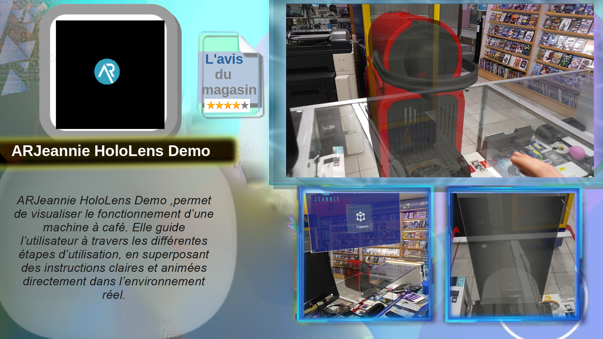 ARJeannie HoloLens Demo ,permet de visualiser le fonctionnement d’une machine à café. Elle guide l’utilisateur à travers les différentes étapes d’utilisation, en superposant des instructions claires et animées directement dans l’environnement réel.