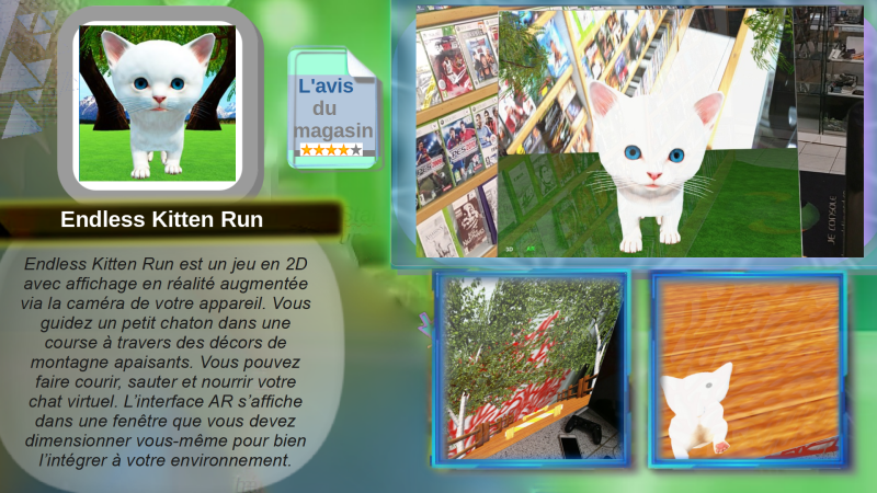 Endless Kitten Run est un jeu en 2D avec affichage en réalité augmentée via la caméra de votre appareil. Vous guidez un petit chaton dans une course à travers des décors de montagne apaisants. Vous pouvez faire courir, sauter et nourrir votre chat virtuel. L’interface AR s’affiche dans une fenêtre que vous devez dimensionner vous-même pour bien l’intégrer à votre environnement.