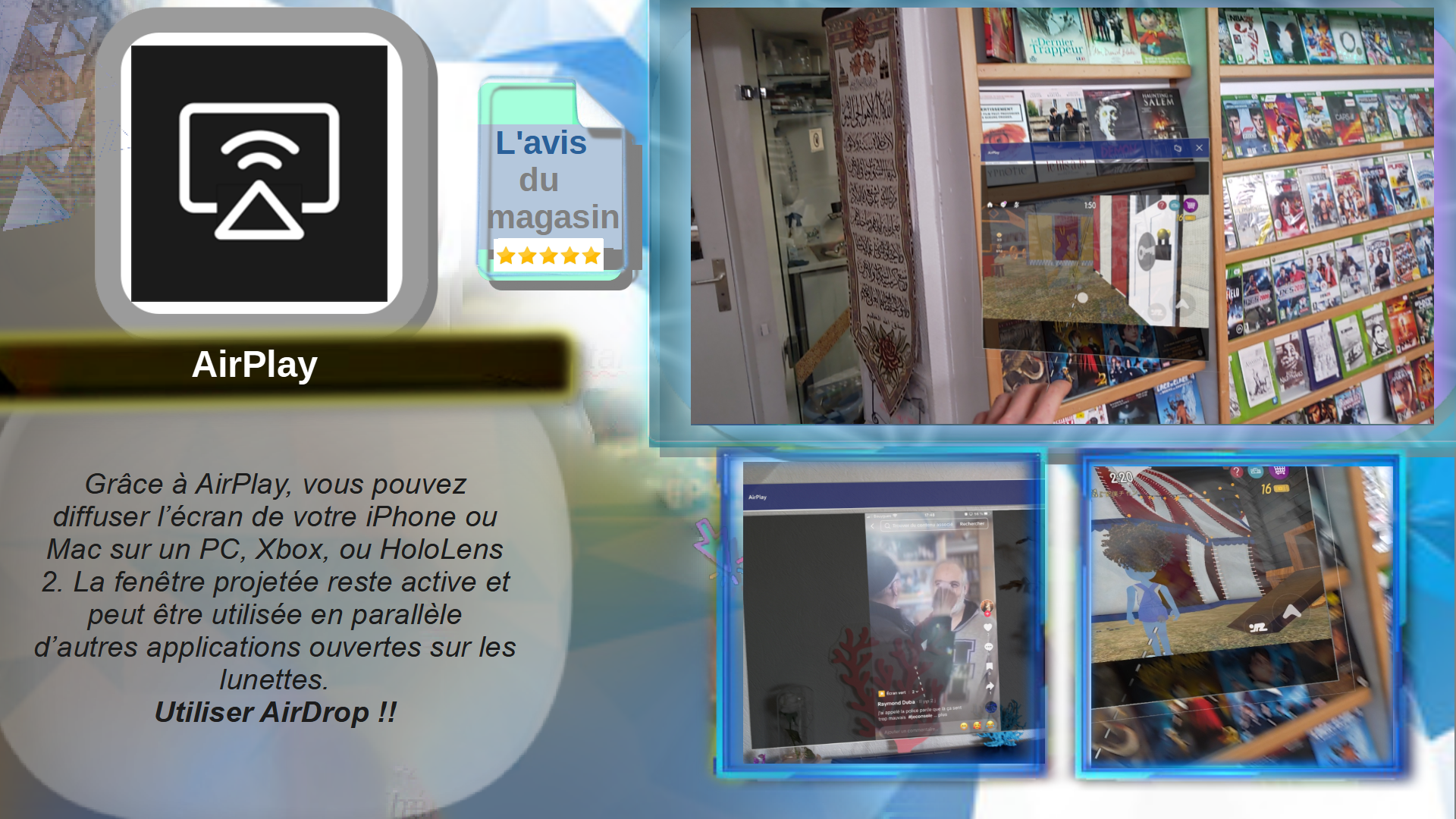 EasyCast permet d’afficher facilement l’écran d’un iPhone ou d’un smartphone Android sur un PC, Xbox, ou HoloLens 2, sous forme de fenêtre flottante utilisable en même temps que d’autres applications. Télécharger l'application. EasyCaste sur votre smartphone !!