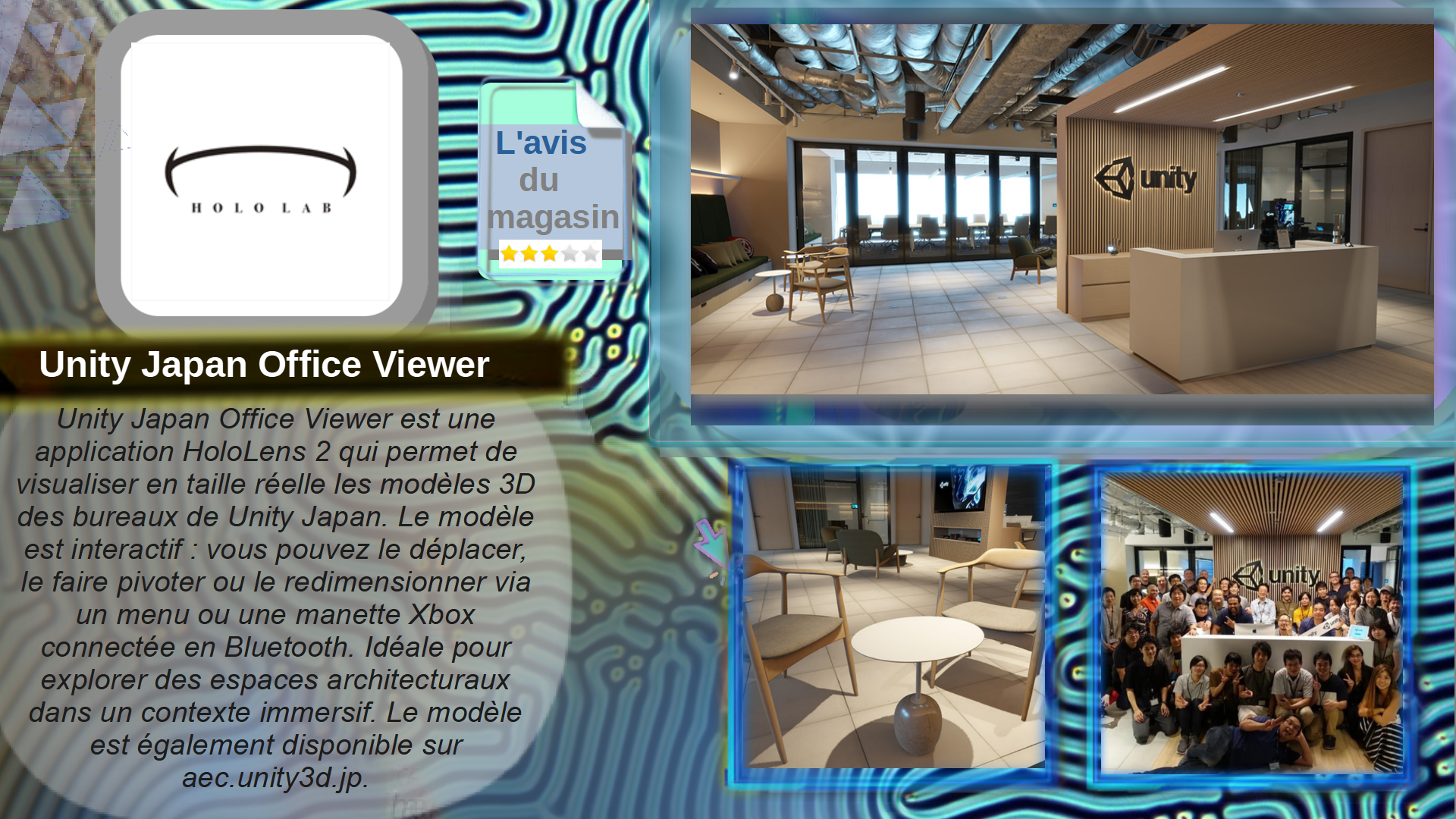Unity Japan Office Viewer est une application HoloLens 2 qui permet de visualiser en taille réelle les modèles 3D des bureaux de Unity Japan. Le modèle est interactif : vous pouvez le déplacer, le faire pivoter ou le redimensionner via un menu ou une manette Xbox connectée en Bluetooth. Idéale pour explorer des espaces architecturaux dans un contexte immersif. Le modèle est également disponible sur aec.unity3d.jp.