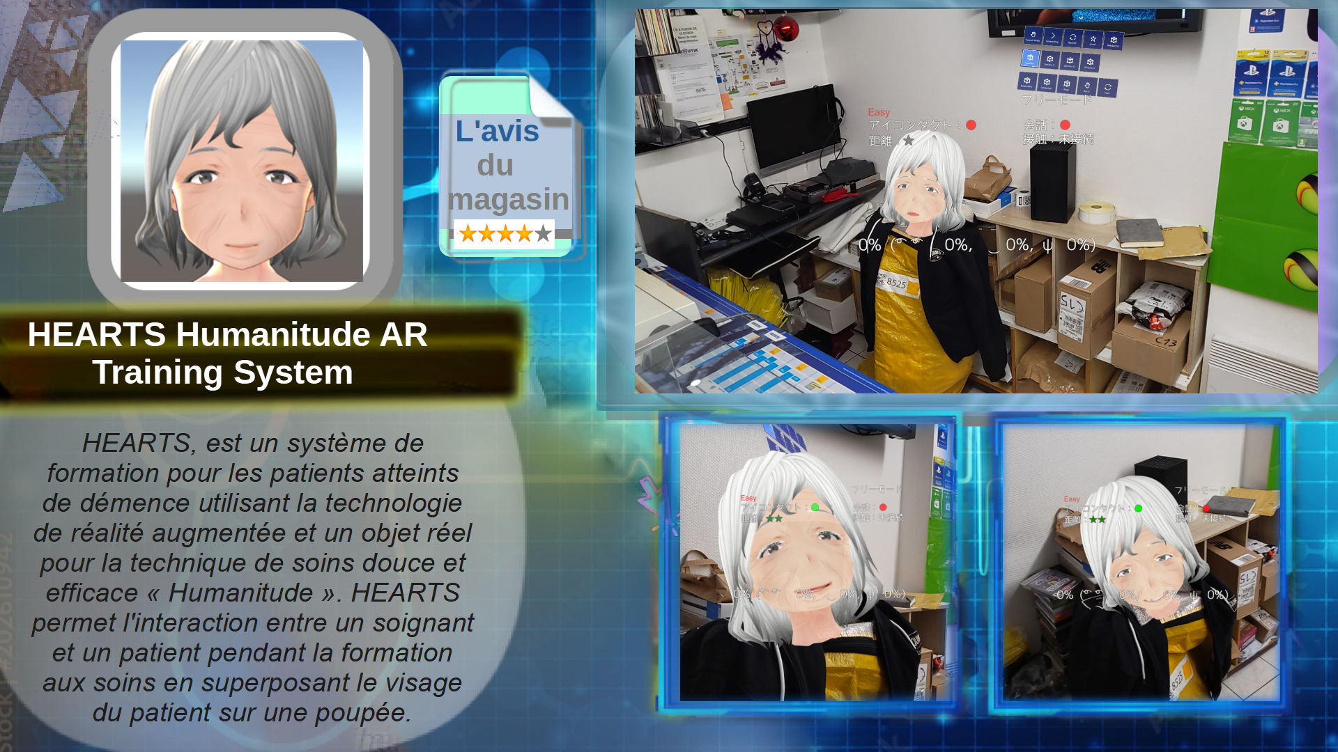 HEARTS, est un système de formation pour les patients atteints de démence utilisant la technologie de réalité augmentée et un objet réel pour la technique de soins douce et efficace « Humanitude ». HEARTS permet l'interaction entre un soignant et un patient pendant la formation aux soins en superposant le visage du patient sur une poupée.