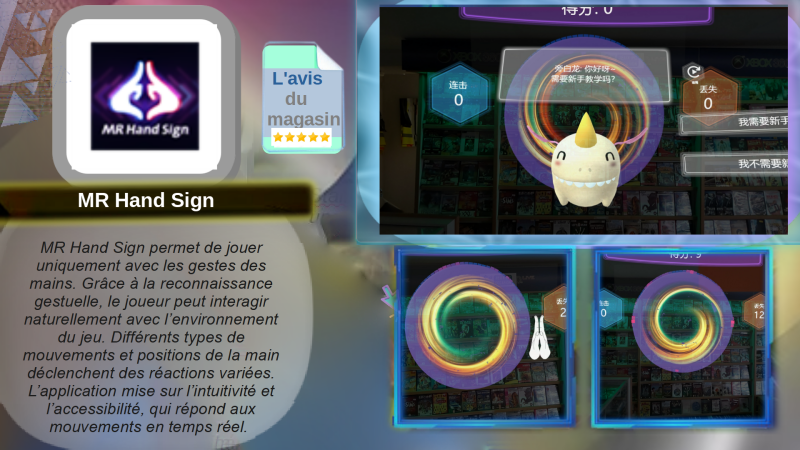 MR Hand Sign permet de jouer uniquement avec les gestes des mains. Grâce à la reconnaissance gestuelle, le joueur peut interagir naturellement avec l’environnement du jeu. Différents types de mouvements et positions de la main déclenchent des réactions variées. L’application mise sur l’intuitivité et l’accessibilité, qui répond aux mouvements en temps réel.
