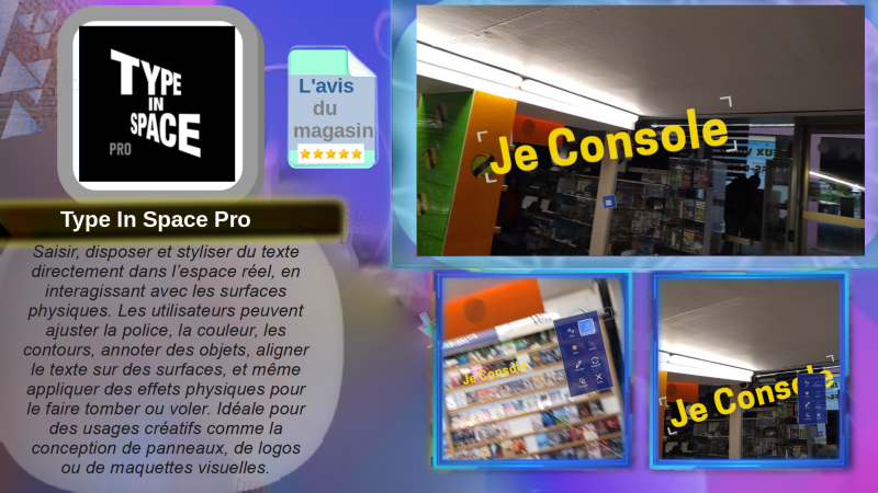 Saisir, disposer et styliser du texte directement dans l’espace réel, en interagissant avec les surfaces physiques. Les utilisateurs peuvent ajuster la police, la couleur, les contours, annoter des objets, aligner le texte sur des surfaces, et même appliquer des effets physiques pour le faire tomber ou voler. Idéale pour des usages créatifs comme la conception de panneaux, de logos ou de maquettes visuelles.