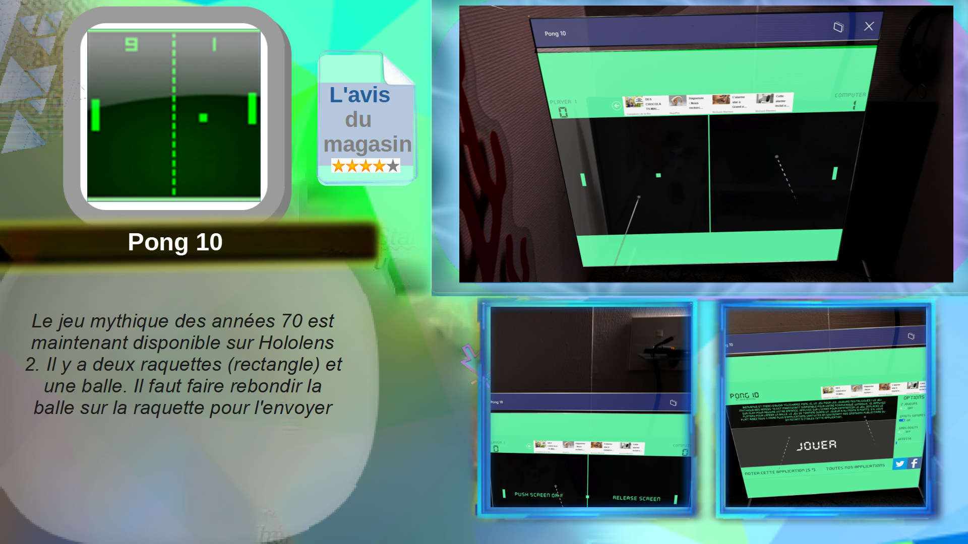 Surfaces, est une jeu qui montre ce qu’on peut faire avec le suivi des mains, dans l’espace réel, vois apparaître des objets en 3D : des formes, des surfaces, des effets lumineux. Tu peux les toucher, les faire tourner, les déplacer, juste avec tes mains. Le but est de tester les interactions naturelles possibles avec le HoloLens 2