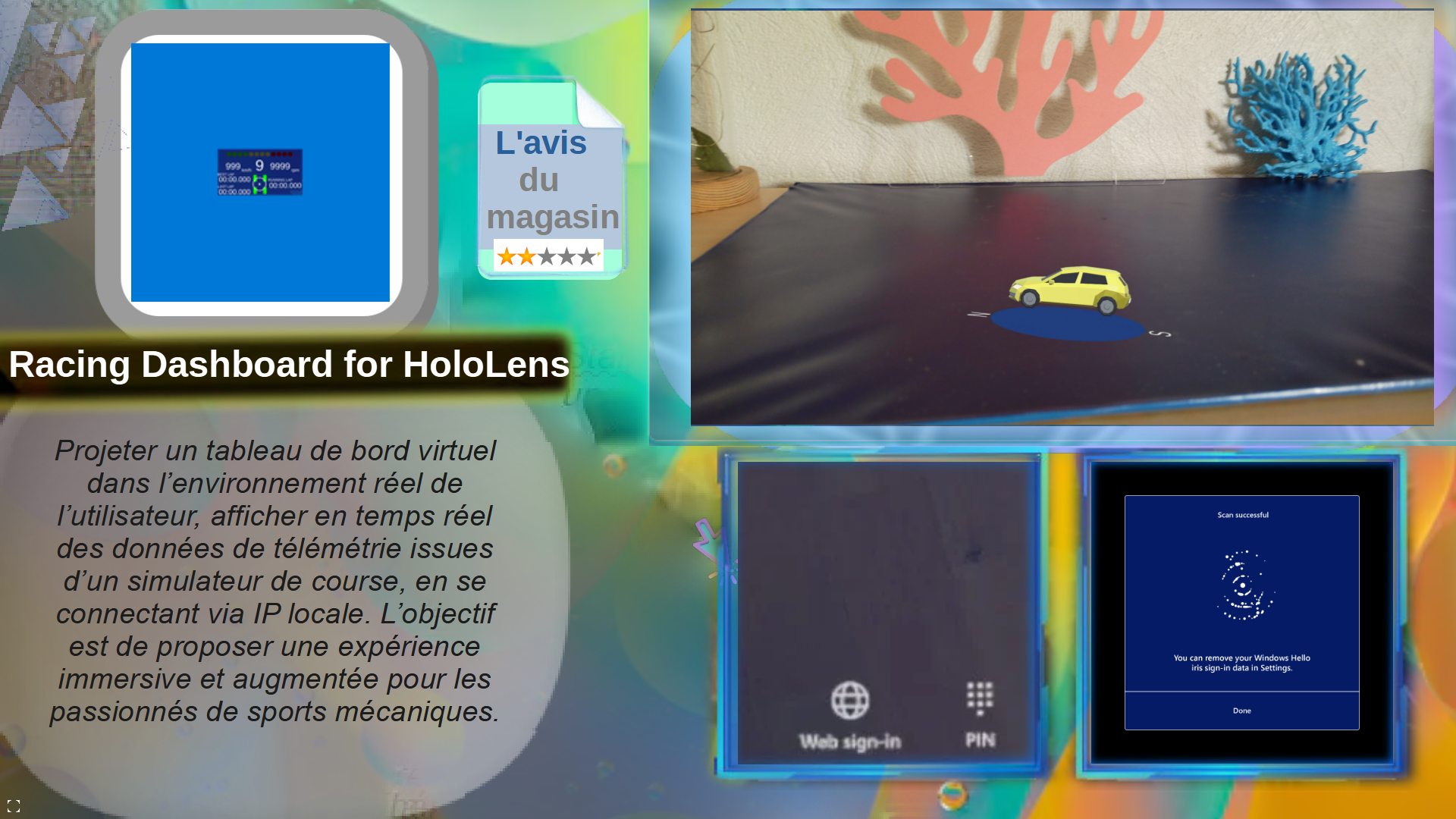 Projeter un tableau de bord virtuel dans l’environnement réel de l’utilisateur, afficher en temps réel des données de télémétrie issues d’un simulateur de course, en se connectant via IP locale. L’objectif est de proposer une expérience immersive et augmentée pour les passionnés de sports mécaniques.